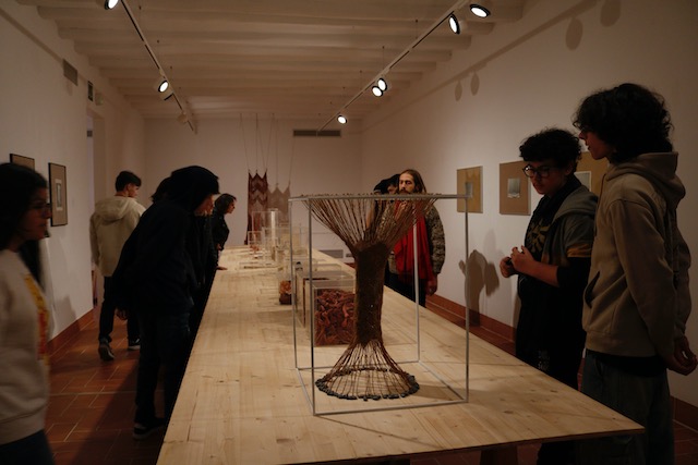 Apropar-nos a l’obra Daniel Steegmann ens ha permès reflexionar sobre el nostre procés creatiu. En la recerca artística que duem a terme amb la Mariona i el Pedro ens hem interessat pels espais i les interaccions que s’hi generen entre les persones. Com l’espai amb estructures per teixir. Hem treballat els espais de l’institut, l’aula per generar accions fora de lloc, per crear espais per teixir, promoure interaccions, activitats personals o compartides… Ens interessa transformar els espais amb les nostres accions i intervencions per generar la possibilitat que hi esdevinguin experiències i trobades noves.