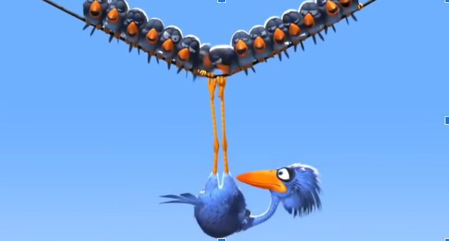 En aquesta peça podem apreciar com uns ocells lluiten pel seu lloc, fins que s’adonen d’un ocell, diferent dels altres. Això provoca una repulsió cap a l’ocell diferent, quan aconsegueixen tirar fora del cable de llum l’ocell gran per ser tan gran y diferent s’adonen que gràcies a aquell ocell no feien efecte tiraxines i quan el llencen se’n van volant, deixant les plumes a l’aire i despullant els ocells.