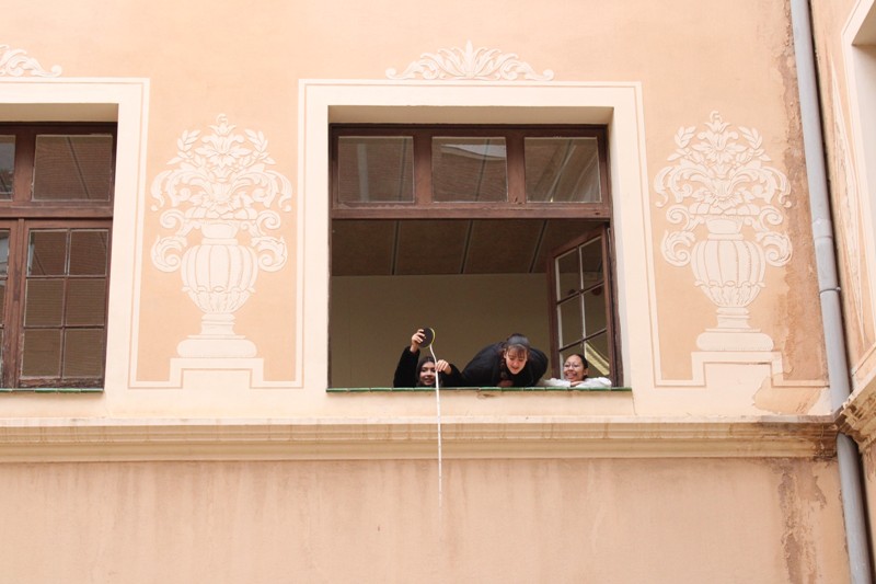 Sortim al pati i extenem unes robes blanques enormes. Les tallem i les encolem, les tenyim. Fem proves en l’espai i decidim la millor manera per fer aquesta primera intervenció.