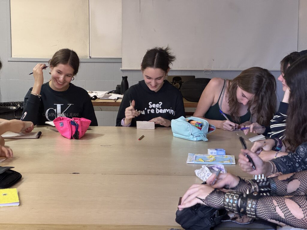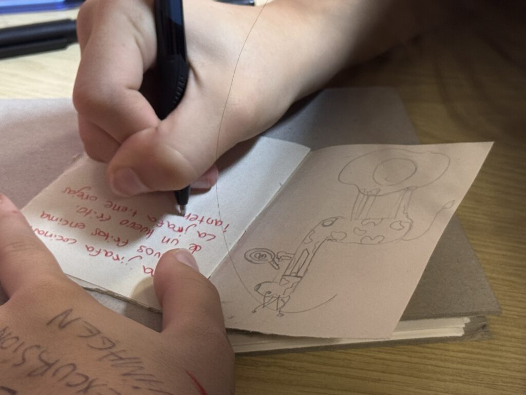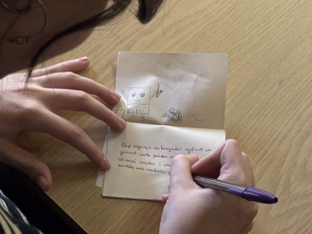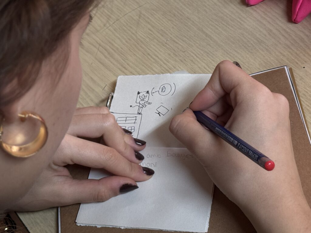 Un cop vam haver-les vist totes, l’Helena ens va proposar jugar a dos jocs: El primer era una variant del conegut joc del telèfon. Consistia a què tots havíem d’escriure una frase aleatòria en uns “mini quadernets” que havia preparat l’Helena per a nosaltres. Llavors, aprofitant que estàvem en rotllana, cada un de nosaltres havia de passar-li aquest quadernet amb la frase, a la persona del costat; i aquesta persona disposava de dos minuts exactes, per dibuixar el que la frase escrita indicava. I així successivament fins que tothom hagués tingut les llibretes de tothom.