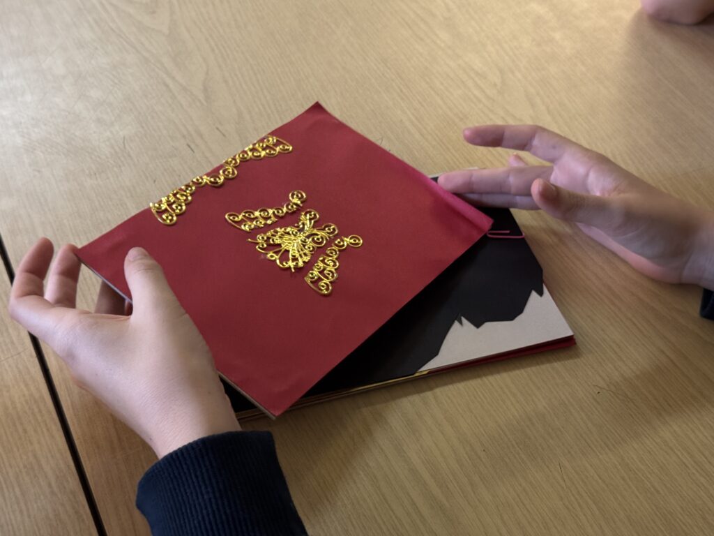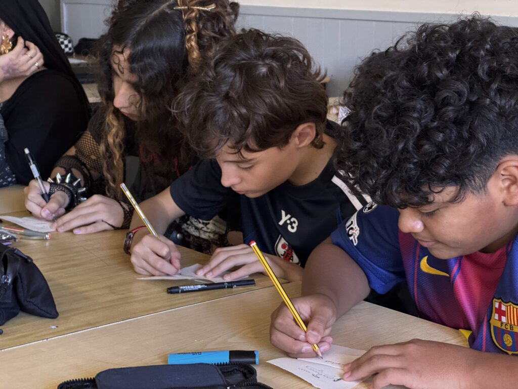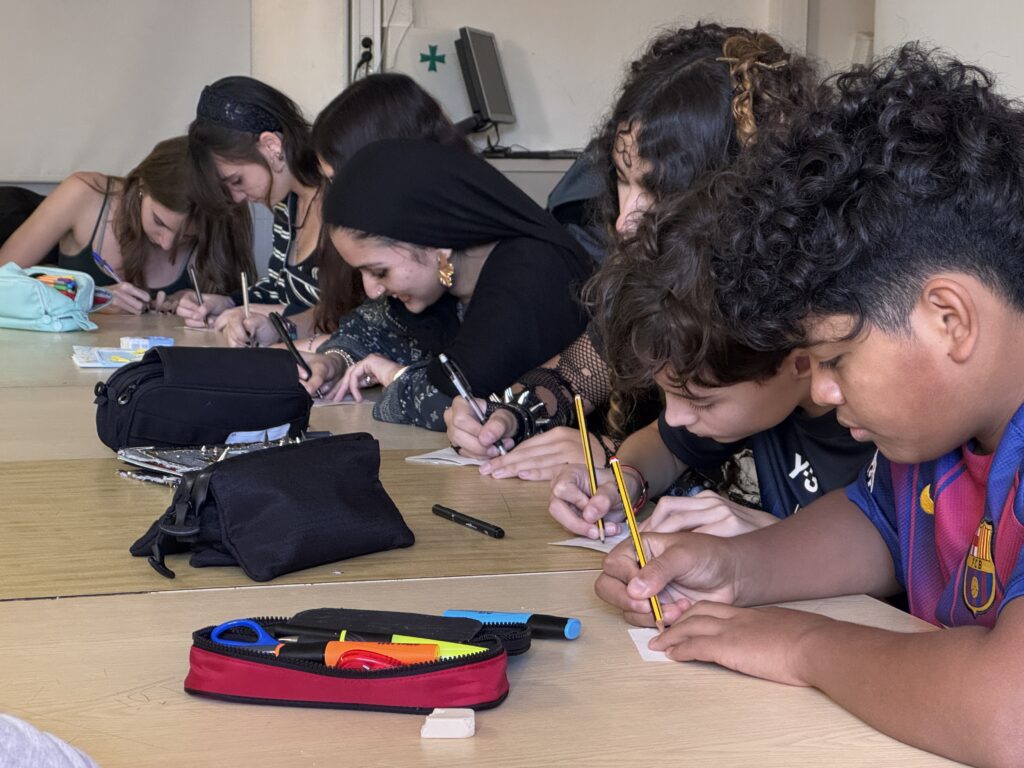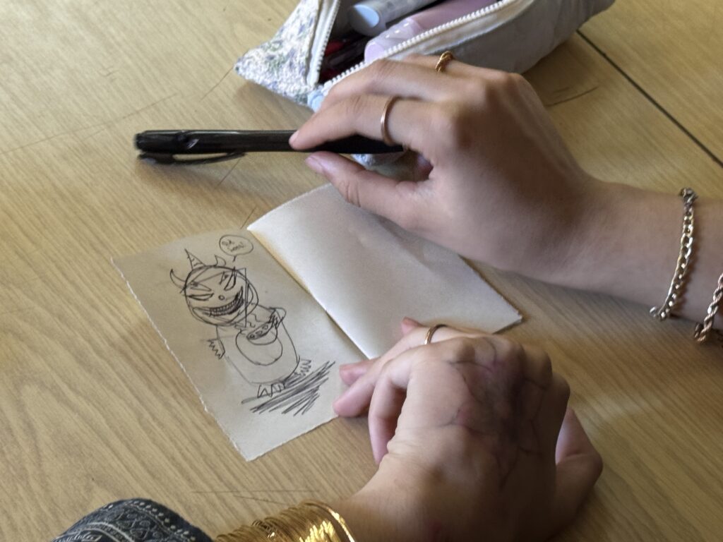 Un cop vam haver-les vist totes, l’Helena ens va proposar jugar a dos jocs: El primer era una variant del conegut joc del telèfon. Consistia a què tots havíem d’escriure una frase aleatòria en uns “mini quadernets” que havia preparat l’Helena per a nosaltres. Llavors, aprofitant que estàvem en rotllana, cada un de nosaltres havia de passar-li aquest quadernet amb la frase, a la persona del costat; i aquesta persona disposava de dos minuts exactes, per dibuixar el que la frase escrita indicava. I així successivament fins que tothom hagués tingut les llibretes de tothom.