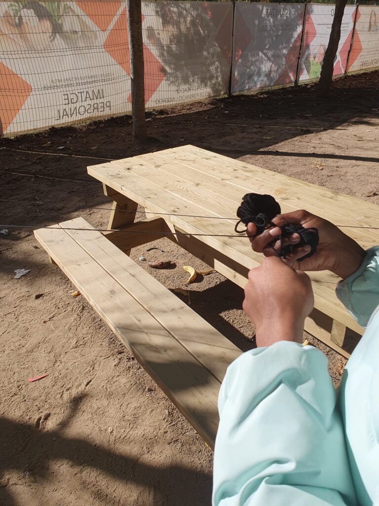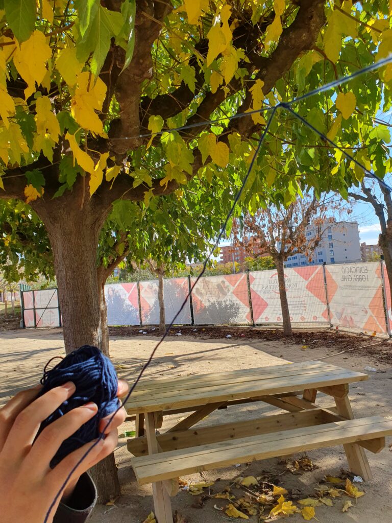 Els alumnes van donar forma a aquesta proposta, tot jugant amb el material, teixint un fil de complicitat que connectava no només els cabdells de llana, sinó també les persones que passaven per l’espai. En el moment en què el recorregut començava a crear-se, l’espai es convertia en un lloc de trobada i de comunicació no verbal. Altres grups van entrar a l’espai, veient el que es feia, i la màgia es va produir: els cabdells no només havien marcat el recorregut, sinó que també havien generat diàlegs, reflexions i, fins i tot, somriures entre qui transitaven per aquell passatge improvisat.